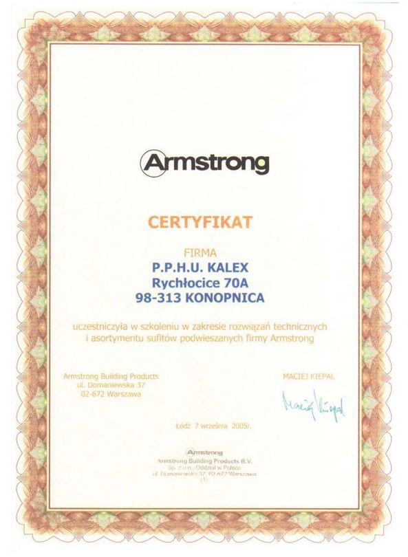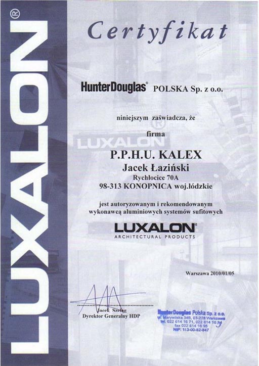 Oficjalny certyfikat autoryzacji jako rekomendowanego wykonawcy aluminiowych systemów sufitowych