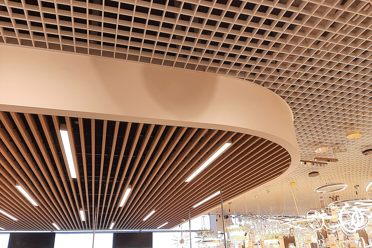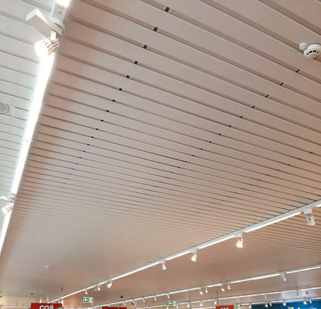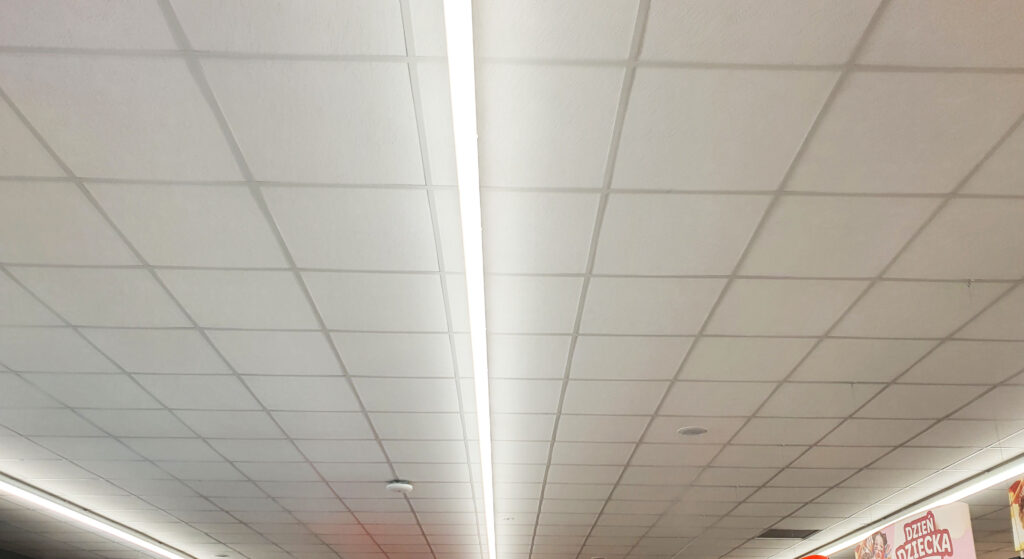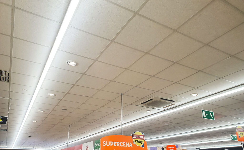 Montaż mineralnych sufitów podwieszanych na budowach pawilonów handlowych LIDL