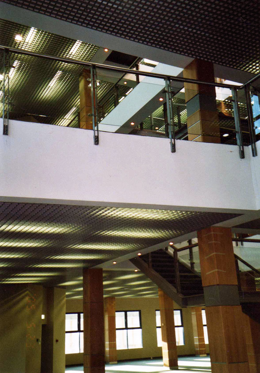 Montaż sufitów podwieszanych Hunter Douglas w budowie Biblioteki i budynku Wydziału Prawa Uniwersytetu Łódzkiego.